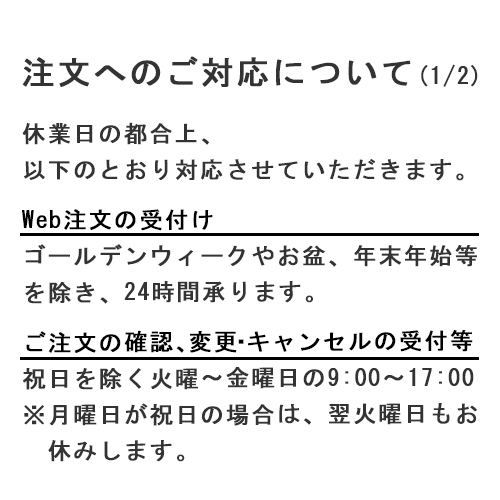 | Web注文の受付 | ゴールデンウィークやお盆、年末年始等を除き、24時間承ります。 |