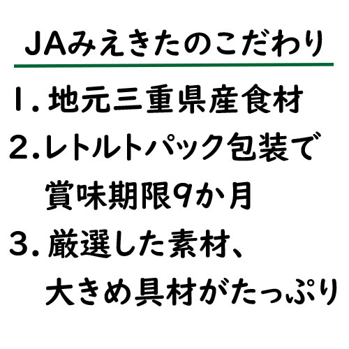 鶏もも肉 ・ にんじん ・ ごぼう ・ 干し椎茸、また、しょうゆ原料である大豆・小麦まで三重県産にこだわりました。地域になじみ深い味わいを、かんたん調理で手軽にお楽しみいただけます。