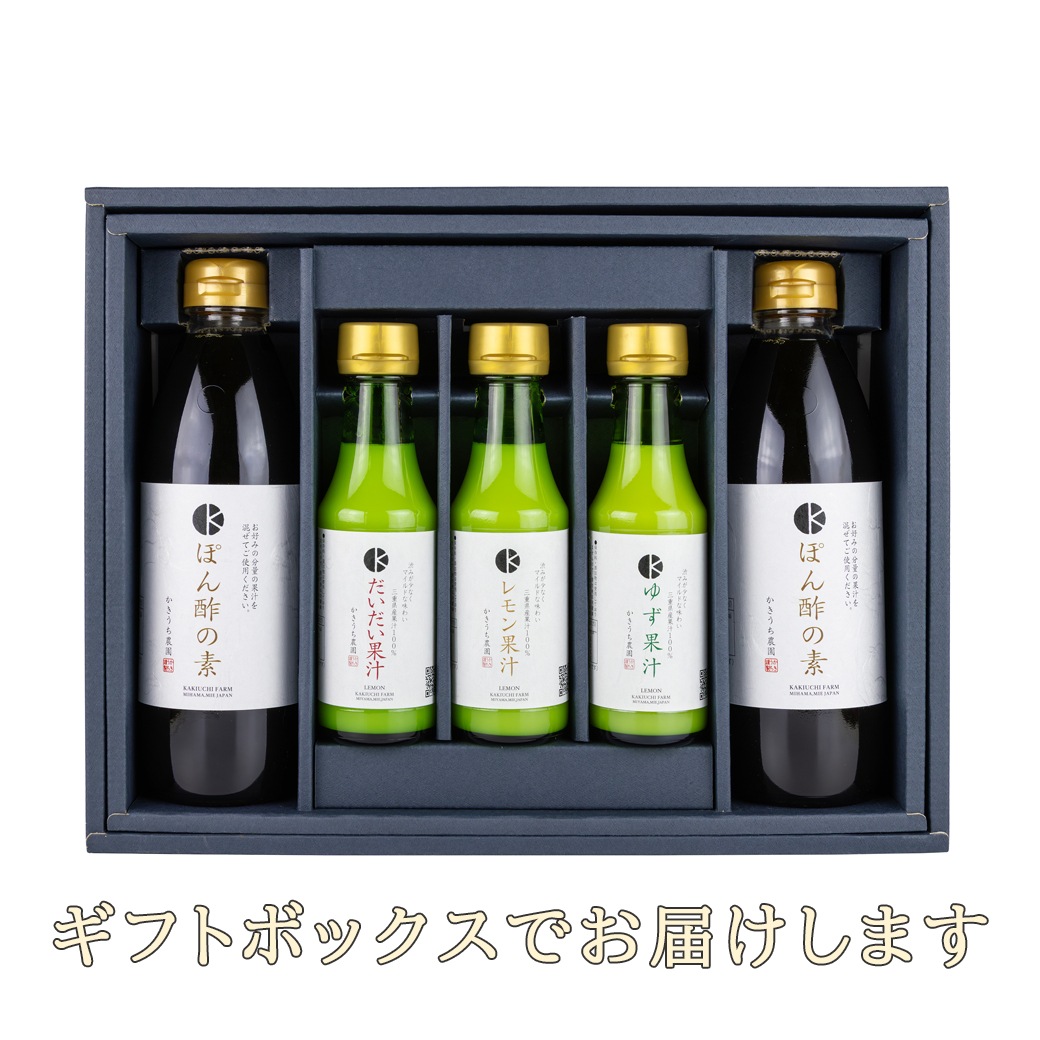 かきうち農園が厳選した3種類の柑橘果汁をセットにしました。お召し上がりの直前にぽん酢の素に合わせることで、柑橘本来の香りをお楽しみいただけます。