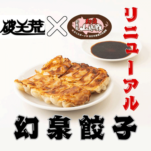 老舗餃子店破天荒とのコラボレーションで、さらにおいしくなりました。自慢の幻泉山﨑豚を100%使用し、国産野菜と門外不出の秘伝のタレを合わせたあんを、その日の天候に合わせて練った自家製皮で包みました。