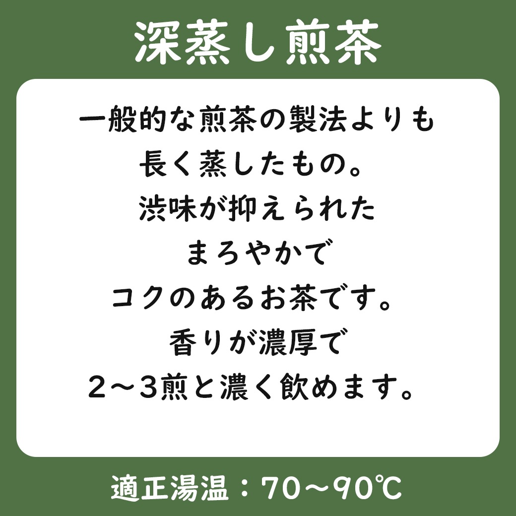 深蒸し煎茶は、一般的な煎茶の製法よりも長く蒸すことで、茶葉の持つ渋味が抑えられ、まろやかでコクのあるお茶に仕上がります。香りも濃厚で2~3煎目でもしっかりと感じられます。「沙耶香」は、茎の甘みと茶葉の旨みを一緒に楽しめる深蒸し煎茶です。