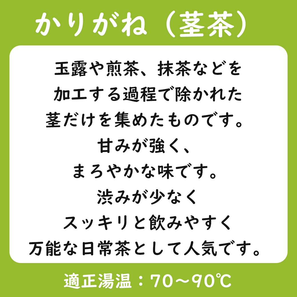 薮北(やぶきた)は、現在日本で最も多く栽培されているお茶の品種です。甘味、旨み、渋味のバランスが非常に良く、濃厚な味わいが特徴で、優雅な香気があります。「雁ヶ音(かりがね)」は、玉露や高級な煎茶の製造過程で選別された「茎」の部分だけを集めたお茶で、茎の甘味と茶葉の旨みを感じられ、まろやか、かつさっぱりとした風味が楽しめる茎茶です。
