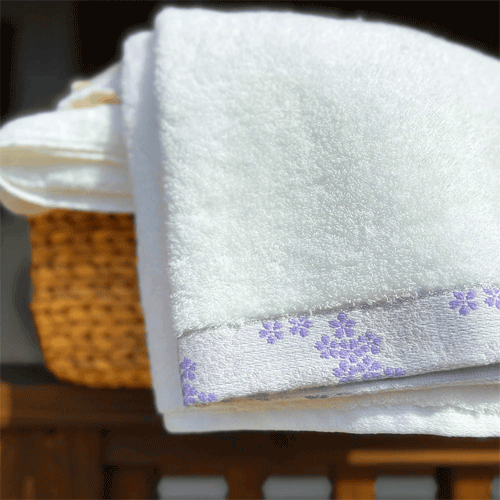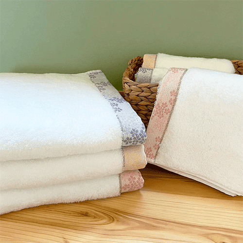 どちらも淡い色合いが美しく、浴室を華やかに彩ります。無撚糸(むねんし)ならではの優しい肌触りは、敏感肌の方や赤ちゃんにもおすすめです。