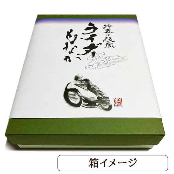 「ライダーもなか」(12個入り)のお取り寄せ。鈴鹿サーキットやバイク好きに。芳ばしい皮と粒あんのうまみ。すっと広がり駆け抜ける甘さをお楽しみいただけます。個包装で、のし対応も可能。ギフトや手土産におすすめです。