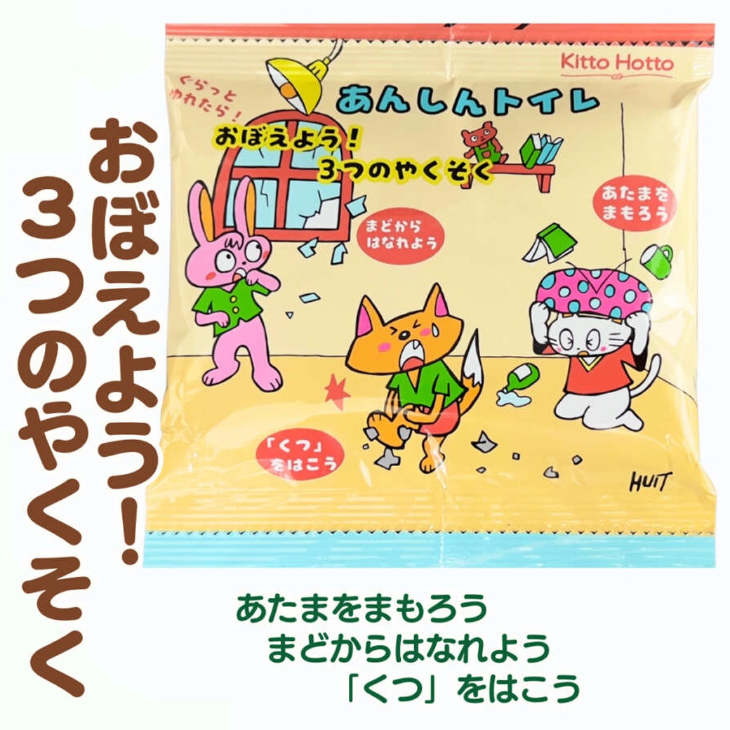 つり下げできるお菓子のようなパッケージにかわいい動物の絵が描かれています。 温かい彩りが防災を身近なもの、こわくないものにしてくれます。商品のパッケージには、電話番号や家族で集まる場所が書き込めます。トイレの壁に貼ることでこどもたちが毎日見て、自然と覚えることができます。